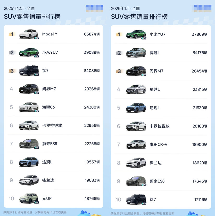 另一方面,头部车型格局出现变化,小米YU7以37869辆拿下SUV及全品类车型的双料第一,且环比降幅不大,展现出较强的市场韧性。反观12月SUV及全车型双料冠军的特斯拉Model Y,1月销量从65874辆骤降至16845辆,直接跌出TOP10。