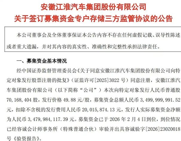 “注册制以来整车行业首个纯研发类募投项目”——这个标签,让江淮汽车这次35亿元定增变得与众不同。更引人注目的是两位投资界顶流葛卫东、方文艳各自掏出10亿元的真金白银,成为了这场转型的关键见证人。