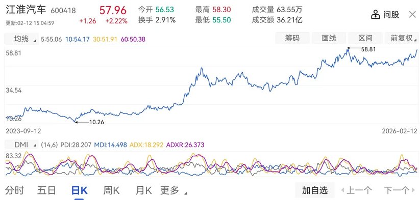 值得一提的是,江淮汽车的股价也已由24年初的10块出头,涨至截止2月12日的58块,涨幅接近6倍。