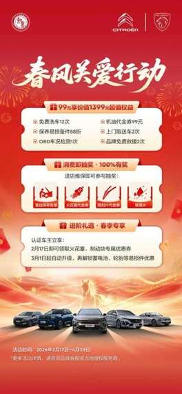 新春伊始,万象更新。东风标致与东风雪铁龙近日正式启动“狮舞龙腾 春风关爱行动”,围绕用户春季用车养护需求,推出三重实用权益与长效保障。此次行动是双品牌“以客户为中心”理念的又一次扎实落地,更标志着服务保障与全时守护体系的持续深化。