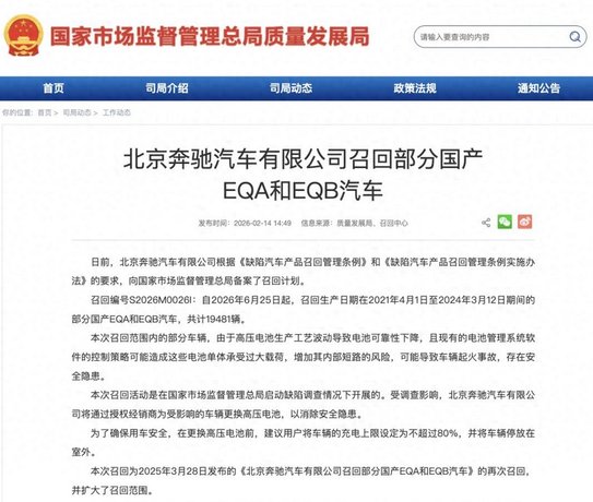 除夕前一天,本该是车企忙着冲销量、发祝福的节点,北京奔驰却突然扔出一枚“召回炸弹”:召回19481辆国产EQA、EQB纯电车型,原因是高压电池可靠性不足、存在短路起火风险。