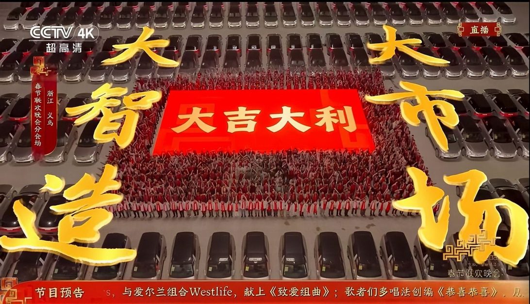 与吉量交相呼应的,是今年春晚的“含吉量”:从主持人小撒张口就来的“讨个吉利”,再到首次担纲总台春晚分会场重任的义乌,用领克900摆出的“吉”字车阵,最后以“大吉大利——大智造大市场”主题画面收官。