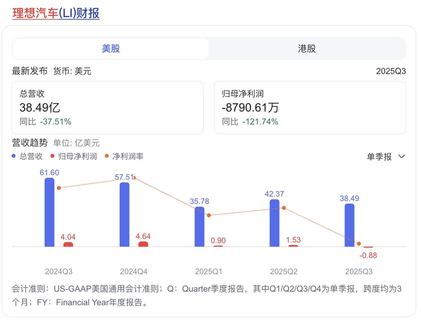 复盘2025年理想汽车的核心经营数据,其困境已清晰显现。销量方面,40.63万辆的交付量,在2025年国内1280.9万辆新能源乘用车总销量中,市场占有率仅约3.18%,远低于比亚迪(35.9%)、吉利(23.6%)等品牌,甚至落后于零跑(4.66%)、小鹏(3.35%)。