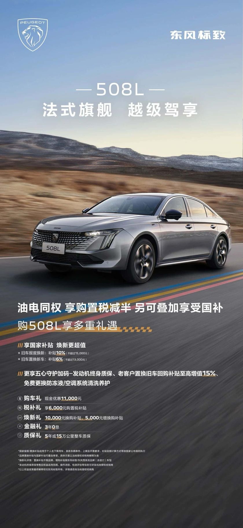 东风标致508L以越级产品实力诠释法式驾控旗舰魅力,更带来诚意十足的新春购车政策:购买508L可享至高4000元品牌直补,多重优惠叠加,进一步降低购车门槛。车型享“油电同权”,全面适用购置税减半政策;同时可叠加现金优惠、购置税补贴、置换/增购补贴,以及3年0息金融方案。更有5年或15万公里整车质保、发动机终身质保等安心保障,全方位减轻购车与用车成本。