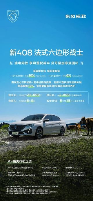 凭借出众的产品实力与贴心配置,东风标致新408 更带来诚意满满的新春购车政策:品牌直补至高3500元,并享25000元现金优惠与4000元购置税补贴,新408龘龘款拉图版更可享3年0息金融方案,全系享 5 年或 15 万公里整车质保,叠加发动机终身质保政策,轻松降低购车用车成本。