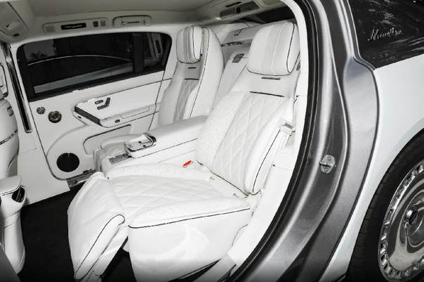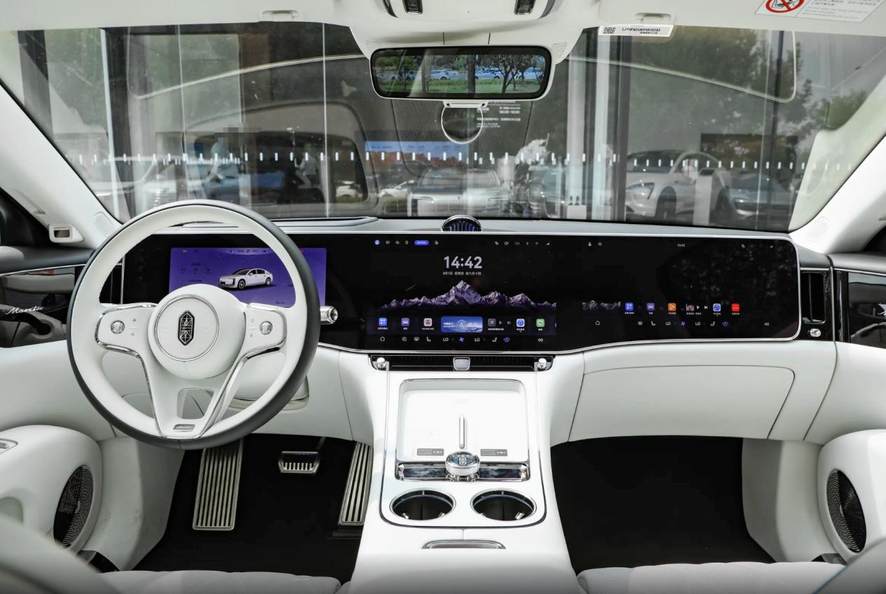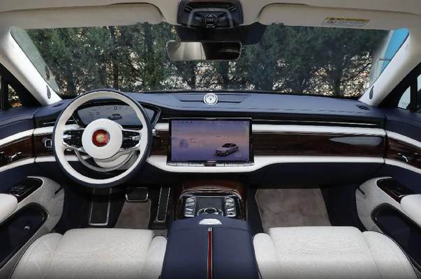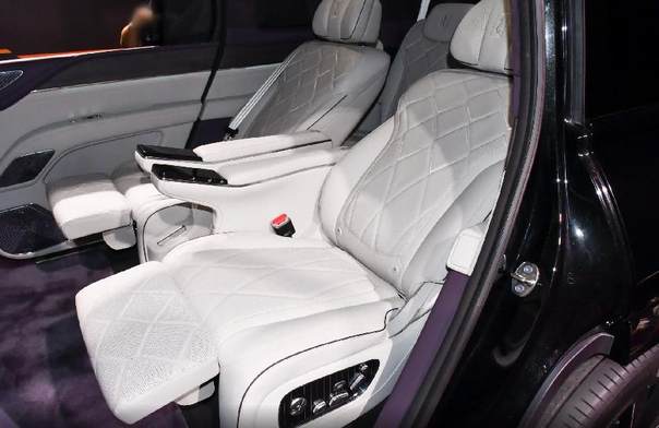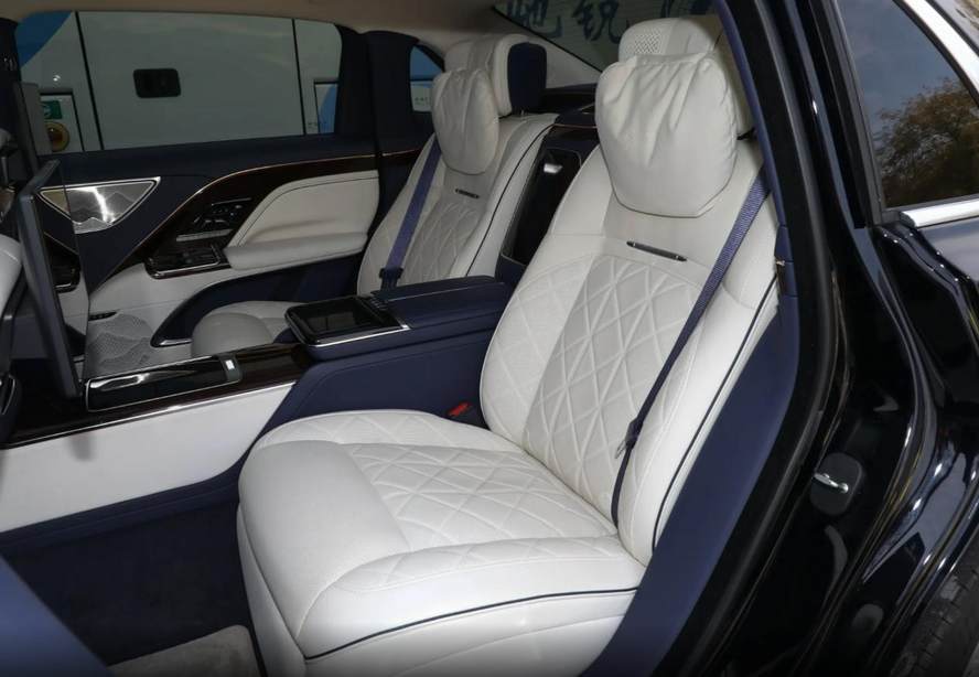 内饰方面,车辆整体造型采用经典与现代的融合,有着复古装饰的双色方向盘,石英钟与大屏相结合的中控台,木纹饰板与触控按键的搭配。座椅的控制按键设计在了车门上,用户不必在屏幕中烦琐地查找功能按键。当然后排也有必要的控制屏幕,两个独立座椅彰显尊贵。后排座椅坐垫相当厚实,拥有座椅调节、加热、通风、记忆、按摩等功能。新车有4门5座和4门4座两种座舱布局,其中4座车型后排采用贯穿式中央扶手设计