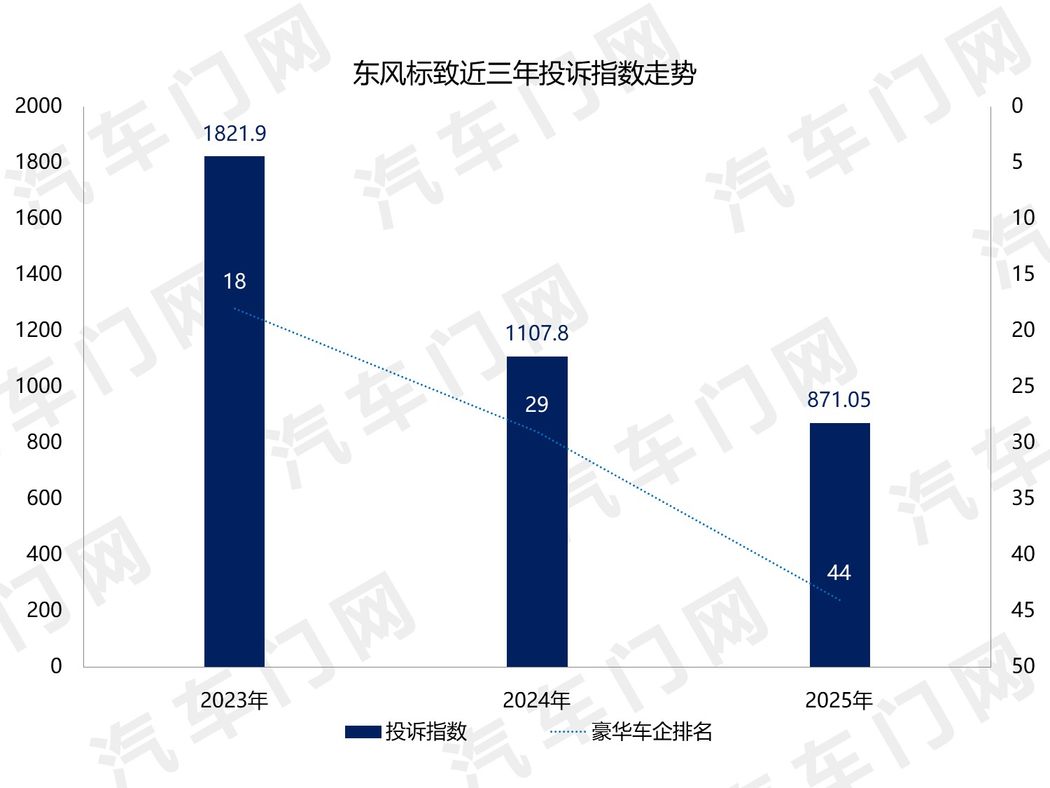 2025年,东风标致的投诉指数只有871.05,排在年度车企投诉指数榜单的第44位。可以说,无论投诉热度还是投诉存在感,2025年的东风标致都很低调。
