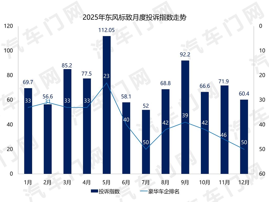月度投诉指数走势显示,2025年全年,东风标致的单月投诉指数都在50-100之间,只有5月投诉指数“破百”。这样的投诉声量远不及投诉榜头部的任何一款单车。