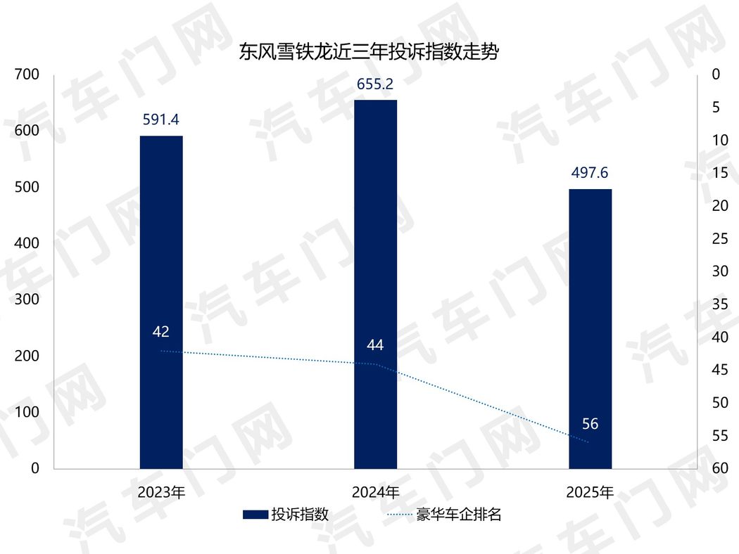 2025年,东风标致的投诉指数只有497.6,排在年度车企投诉指数榜单的第56位,投诉声量进一步下降。