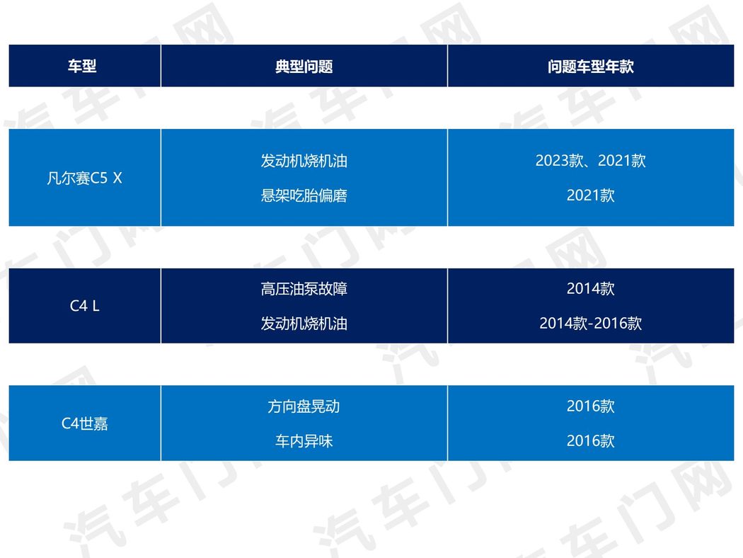 从具体涉诉车型的投诉问题来看,投诉指数最高的凡尔赛C5 X主要问题在于发动机烧机油和悬架吃胎偏磨,问题多发于2021款和23款车型。C4 L的槽点仍集中于高压油泵故障和发动机烧机油。C4世嘉的问题也是老生常谈的方向盘晃动和车内异味。