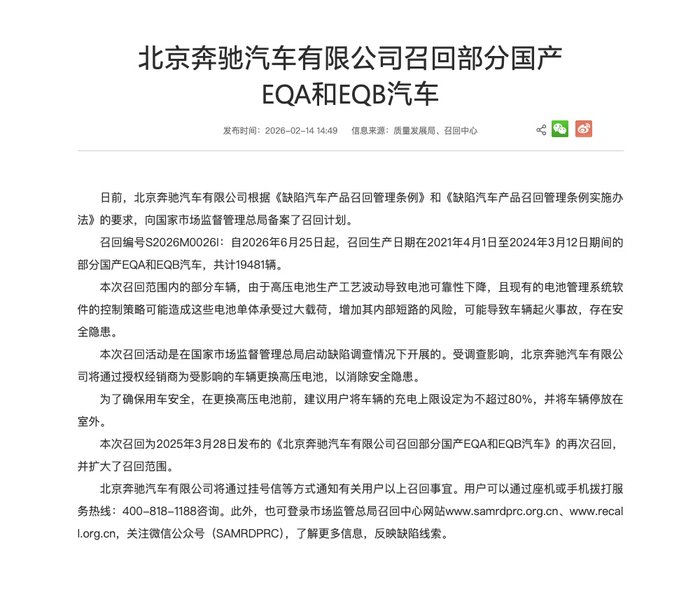 近日,北京奔驰给国家市场监督管理总局报备了召回计划,打算从6月25号开始,再召回一批国产的EQA和EQB纯电动车,一共涉及19481辆,这些车都是2021年4月到2024年3月之间生产的。这次召回其实是去年3月那次的“升级版”——上次已经召过12308辆了,但监管部门调查后发现,之前的解决办法没把安全隐患彻底除掉,所以才要扩大范围接着处理。