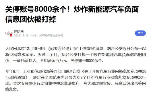 历经数月侦查,警方成功打掉一个专门炒作车企负面的犯罪团伙,抓获12名嫌疑人,查扣涉案资金超百万元,关停违规账号8000余个。