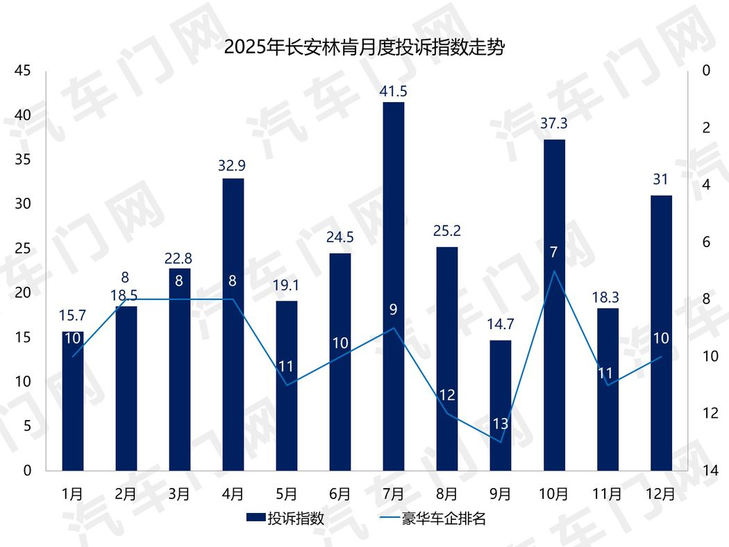 作为一家二线豪华车企,长安林肯的体量较小,投诉指数也一直较低。2025年,长安林肯的全年投诉指数只有301.5,远低于头部一线豪华车企,甚至不及投诉指数高的单一车型。