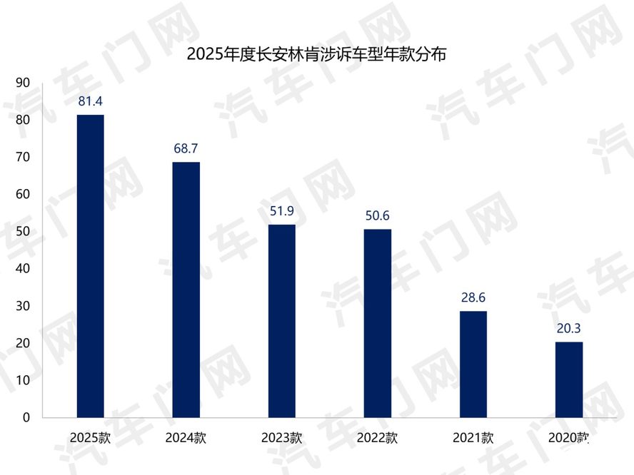 从投诉年款来看,长安林肯的投诉指数根据年款由新到旧依次递减,前三年内的新车投诉指数占比超过了2/3。