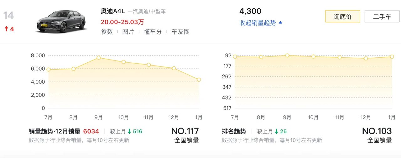 那么这台2026款A4L存在的意义是什么?我觉得奥迪是在玩一出双车并行或者是清库存式升级。1月份奥迪A4L的销量是4300辆,位列第14位。这个成绩,对于曾经的豪华三剑客来说,简直是扎心。宝马3系和奔驰C级虽然也在降价,但销量还是比A4L稳。再加上自家兄弟一汽奥迪A5L也要来了,这台2026款A4L更像是在新旧交替空窗期,用来稳住底盘的一张牌。