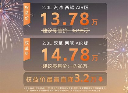 2月24日上午,全新广汽丰田威兰达AIR版上市,下订可享现金优惠2.2万元,再加上国补、厂补1万元,直降3.2万元,最终权益价13.78-14.78万元。
