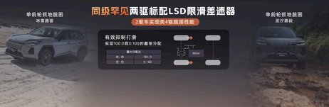 有意思的是两驱版车型标配LSD限滑差速器,号称可“实现类四驱脱困性能”,而E-FOUR四驱版通过行星齿轮结构增大发动机功率驱动前桥电机,前后轮扭矩分配最高达20:80,后轮扭矩调节范围覆盖0:100,提供行车稳定性。