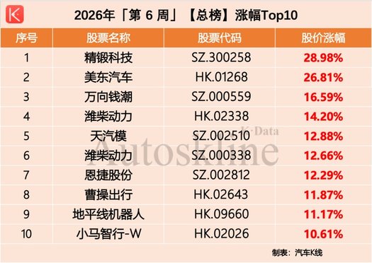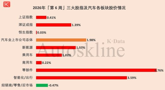 2026年第6周,《汽车K线》统计在册的136只汽车股,股价平均上涨1.98%,扭转了前期连续两周下跌的颓势,景气度回升。