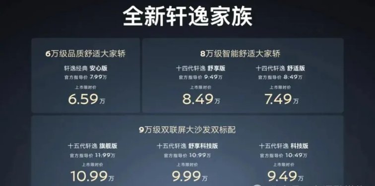 十五代轩逸上市后,与轩逸·经典、十四代轩逸联袂打造全新轩逸家族,满足中国家庭多样化需求。其中,6万买轩逸・经典,品质纯粹,可靠又舒适,安心之选;8万买十四代轩逸,兼顾智能科技与驾乘质感,舒适之选;9万买十五代轩逸,双联屏大沙发双标配,定义智能家轿新高度,智慧之选。对于中国家庭来说“选家轿,必有一款轩逸,适合你!”