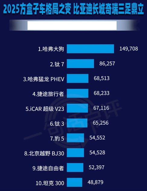 哈弗大狗单一车型,2025年售出约15万辆,是长城汽车方盒子SUV的销量担当,稳居方盒子SUV单品销冠宝座。