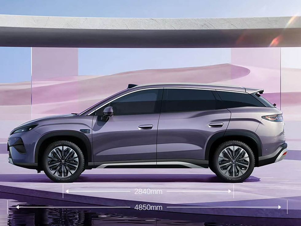 第二张是侧面照片,可以看到侧面造型修长、典雅,整体也是传统SUV的设计,显然空间和家用是它的卖点和定位。具体尺寸方面,它的长宽高分别为4850/1910/1670mm,轴距为2840mm,定位为中型SUV。细节方面,新车采用了半隐藏式门把手,兼顾实用和风阻。B/C/D柱都是黑色的设计,以此给人一种悬浮式车顶的感觉,当然这也提升了新车的年轻气息。对了,本次图片中的是紫色配色,估计这也是新车的主打色。