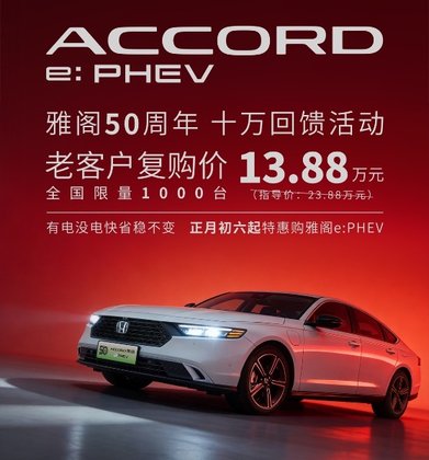 根据海报内容,此次是雅阁50年专门推出的特惠购车活动,全国限量仅1000台,但只针对老客户,对应的插混车型指导价是23.88万元,现在购买仅需13.88万元,基本算是“骨折价”。