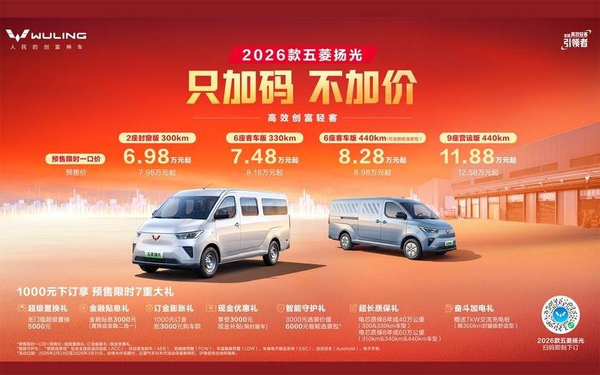 高效可靠,创富好帮手!2月24日,新能源轻客销冠五菱扬光家族迎来焕新升级——2026款五菱扬光正式预售。作为高效创富轻客,新车实现了“续航、动力、智能”三大维度升级,以“只加码不加价”的诚意定价与越级产品力,定义新能源高效轻客标准,致力于成为城配市场货运司机群体的创富首选。