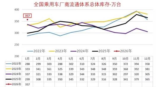 2月25日,乘联分会秘书长崔东树发布数据显示,2026年1月末我国乘用车行业库存357万辆,较上月下降8万辆,较2025年1月增58万辆,库存高位运行。