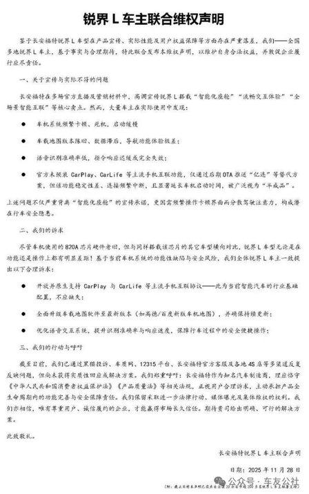 2025年11月,长安福特锐界L车主发布集体维权声明,就车机问题导致行车过程的安全隐患,向长安福特品牌明确提出核心诉求。主要包括开放并原生支持CarPlay与CarLife 等主流手机互联协议、全面升级车载地图软件至最新版本、优化语音交互系统等。