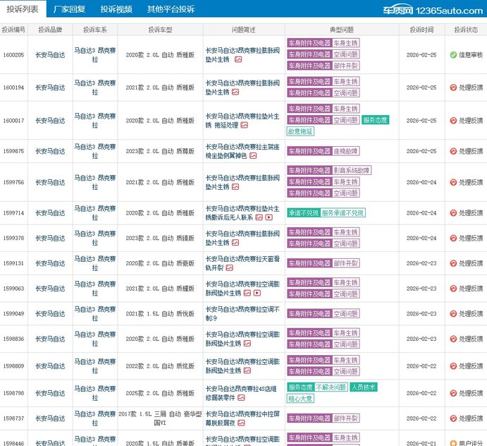 根据车质网最近一周投诉数据显示,长安马自达昂克赛拉的投诉量达到了20例,涉及到车身附件等车内外的多个方面。其中数量众多、比较严重的是车身生锈和空调问题。