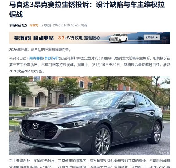 • 2020–2023款 昂克赛拉:空调膨胀阀生锈投诉极多,无官方召回