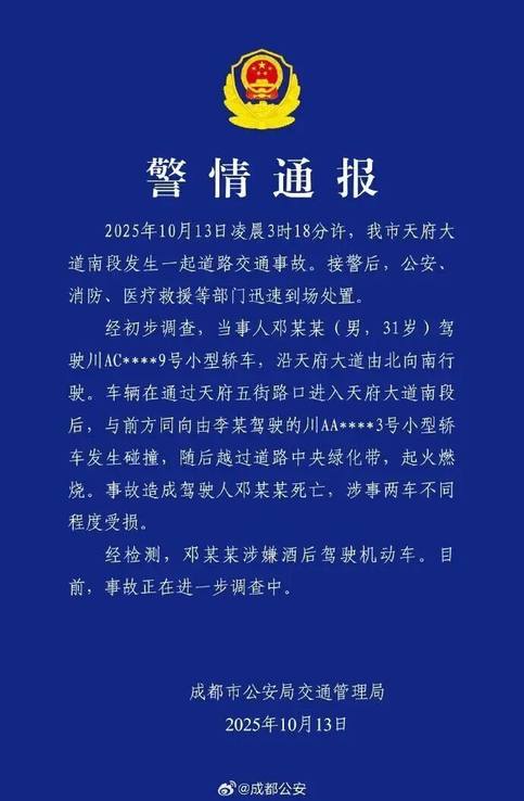 2025年10月13日,成都公安发布的警情通报显示,当日凌晨3时许,成都天府大道南段发生一起道路交通事故,当事人邓某某(男,31岁)驾驶小型轿车,行驶过程中与前方同向由李某驾驶的小型轿车发生碰撞,随后越过道路中央绿化带,起火燃烧;事故造成邓某某死亡,经检测,其涉嫌酒后驾驶。