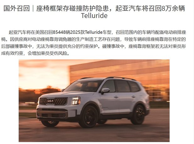 2026年2月27日,一则来自美国国家公路交通安全管理局(NHTSA)的消息引发了行业关注:起亚美国公司正在召回85448辆美国市场车辆,原因令人不安——座椅靠背框架在碰撞时无法有效约束车内人员,从而增加了受伤风险 。