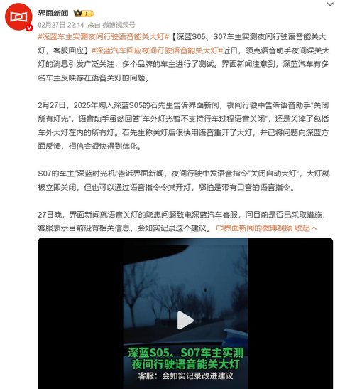 近日,领克汽车因语音误识别误关夜间行车关大灯撞车的事故,引起了广泛的关注。媒体消息显示,有深蓝用户实测显示,深蓝S05/S05语音同样能关大灯。对此,深蓝汽车客服进行了回应。