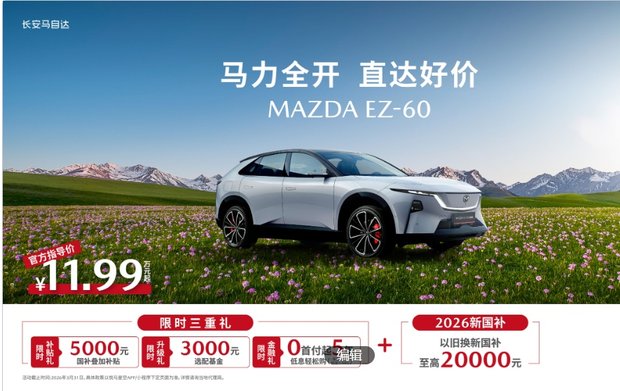 自上市以来,EZ-60凭借“更安全、更可靠、更智能、更适配、更富驾趣”的产品力,斩获央视“第一发布”认证、全球四大顶级设计大奖等荣誉。通过持续的智能化迭代,长安马自达致力于让车辆与用户需求同频进化,不断刷新合资新能源SUV的智能体验上限。目前,EZ-60运动版现已上新到店,同步带来三重新春限时购车礼遇(活动截至2026年3月31日):