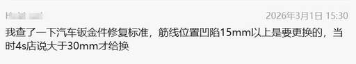 另外,李先生查了一下汽车钣金件修复标准,筋线位置凹陷15mm以上是要更换的,当时4s店说大于30mm才给换。