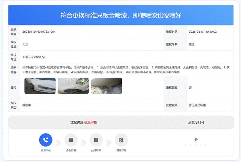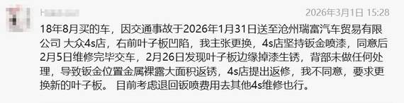据李先生介绍,其车辆于2018年8月购买,为捷达17款自动时尚1.5L车型。2026年1月31日,该车辆因交通事故受损,右前翼子板出现凹陷,李先生将车辆送至沧州瑞富汽车贸易有限公司大众4S店进行维修。维修初期,李先生明确主张更换右前翼子板,但该4S店工作人员坚持采用钣金喷漆的方式进行修复,李先生最终同意了该维修方案。
