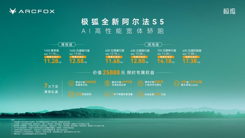 据了解,即日起下定全新阿尔法S5,用户可享受5000元购置税专项补贴、价值4999元家用充电桩抵扣券(安装服务以官方授权服务商为准)、包含高级舒适头枕和全景天窗遮阳帘在内的小狐同学见面礼、整车5年/12万公里质保、三电终身质保、3年免费不限流量和终身免费OTA权益等7重限时尊享礼遇,总价值至高25888元。