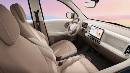 第五代宏光MINIEV内饰设计简约中藏巧思,圆润中见秩序,在细节处展现出精致复古和简约时尚的趣味融合。新车升级为同级领先的怀挡设计,搭配多功能方向盘及10.1英寸中控屏,大幅提升驾驶安全性与便利性。“环扣交融”门饰板、“灵动岛”式一体化副仪表台等设计均采用环形元素设计巧思,环环相扣,搭配“星钻流光”镀铬饰条,将艺术观感和实用储物完美结合;全新升级的棕白格趣座椅质感舒适性全面提升,前排座椅靠背向后放倒最大可达164°,随时都可休息小憩。