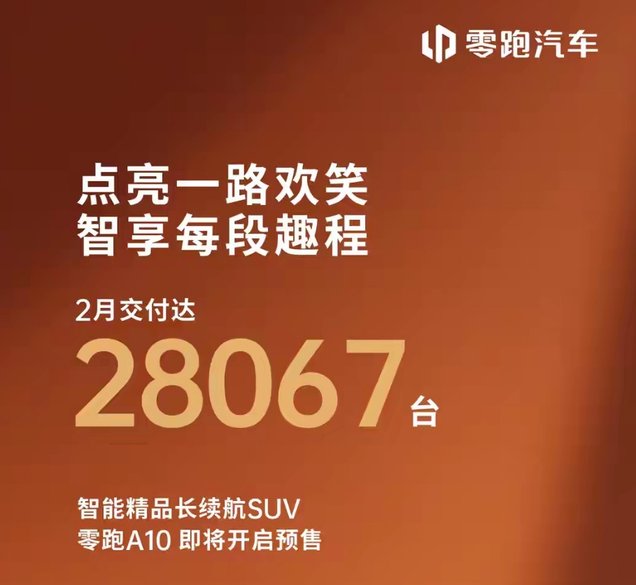 零跑汽车2月售28067台,同比涨超10%,环比下滑超12%