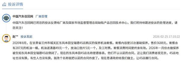 在中国汽车召回网上有用户投诉,“2020年买的10次保养套餐,用了不到一半,4S店突然就倒闭了。”甘肃兰州的赵先生至今仍感到愤怒。他曾在当地东风本田宝瑞德4S店花费3688元购买了一份“终身有效”的基础保养套餐,然而2026年1月,当他再次前往保养时,却发现店面已改头换面,新接手的德泰昌4S店以“不是我们卖的”为由,拒绝履行原合同。