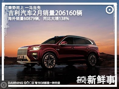 吉利汽车2月销量206160辆!海外销量60879辆,同比大增138%
