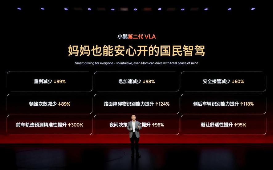 何小鹏在现场提出一个朴素标准:只有妈妈都喜欢开,才叫国民智驾。好的智驾应该像乘坐电梯,按下启动键,就能安心从家抵达公司。围绕这份“简单、安心、丝滑”,第二代VLA在三大维度实现质变:安心丝滑,可识别异形车、避让行人动物、烂路预减速,用“洒了么”工具把舒适度量化可见;全场景覆盖,园区、乡村、无导航道路均可通行,支持原地起步,真正做到全程辅助;效率比肩老司机,综合通行效率提升23%,晚高峰实测比传统L2与Robotaxi更快。