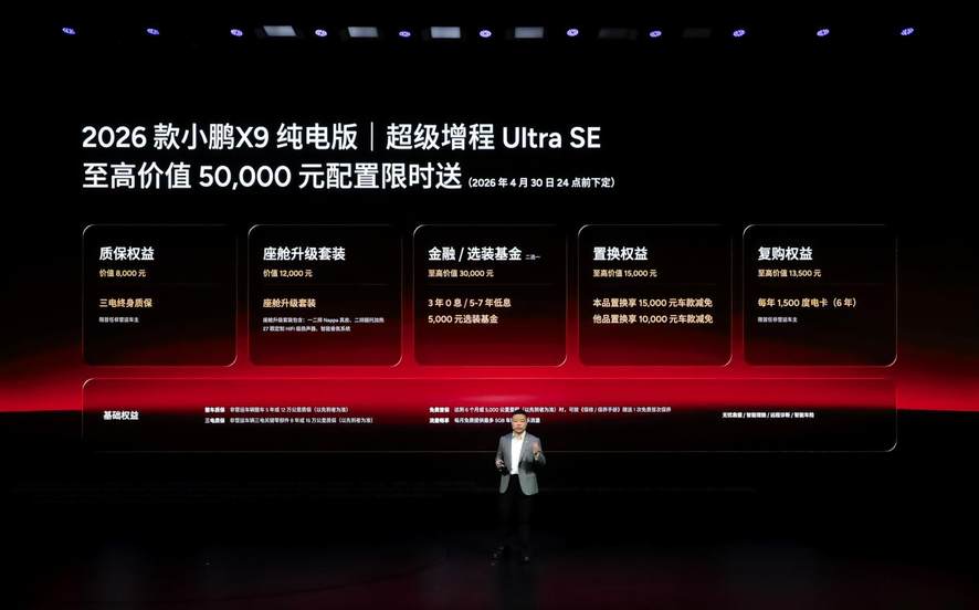 即日起至2026年4月30日24点(含)前下定2026款小鹏X9纯电版,可享最高价值50,000元 权益限时送,包含三电终身质保、价值12,000元的座舱升级套装、至高价值30,000元金融/选装基金、至高价值15,000元置换权益以及每年1500度电卡(6年)的复购权益。2026款小鹏X9超级增程权益与2026款纯电版权益一致(2026年3月31日24:00前下定),此外24和25款的小鹏X9车主置换26款小鹏X9可以获得额外1万元的代金券补贴。(2025年11月20日已发放)
