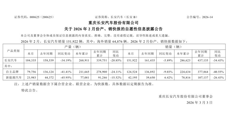 3月初,长安汽车(集团)如期递上了开年第二份成绩单。根据其发布的产、销快报,2月销量达到15.19万辆,虽然与去年同期相比微降5.89%,但相较于1月的“深蹲”行情,这一数字犹如早春的一抹暖阳,让市场紧绷的神经稍微舒缓。