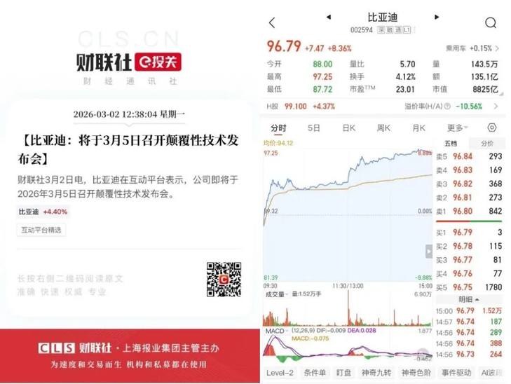 技术层面的布局同样释放积极信号。3月2日,比亚迪在互动平台宣布将于3月5日举行颠覆性技术发布会,相关消息发布后市场反应迅速,公司A股当日上涨8.36%。资本市场的反馈,显示出投资者对企业硬核技术实力的高度认可与信心。