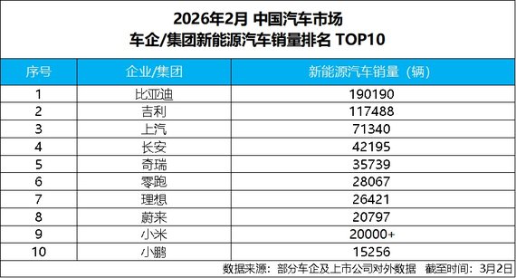 根据近期车企及上市公司对外披露的数据,比亚迪集团2月新能源汽车销量达190190辆,再度位居行业首位,在主流车企中持续保持明显领先优势,以稳定而强劲的表现巩固头部地位。