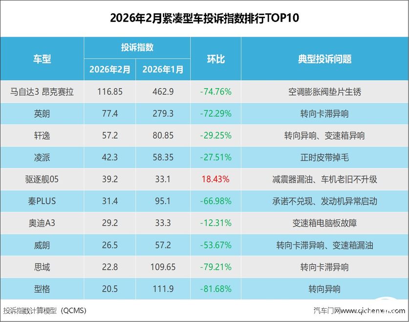2026年2月紧凑型车投诉指数排行:投诉整体回落