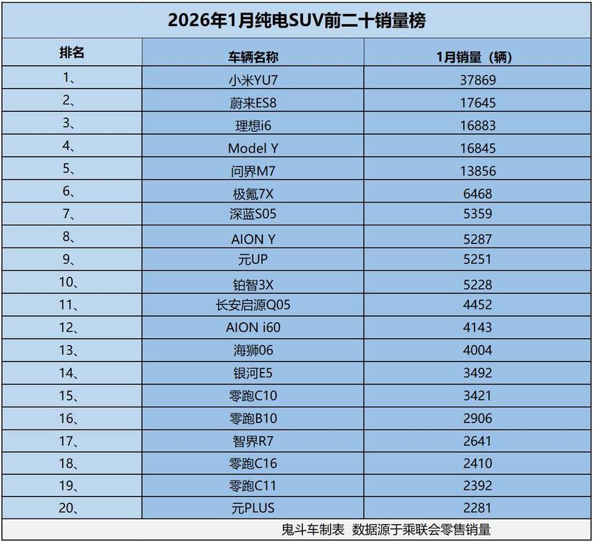纯电SUV降温了! 1月销量榜出炉 仅5款销量过万 理想i6第三