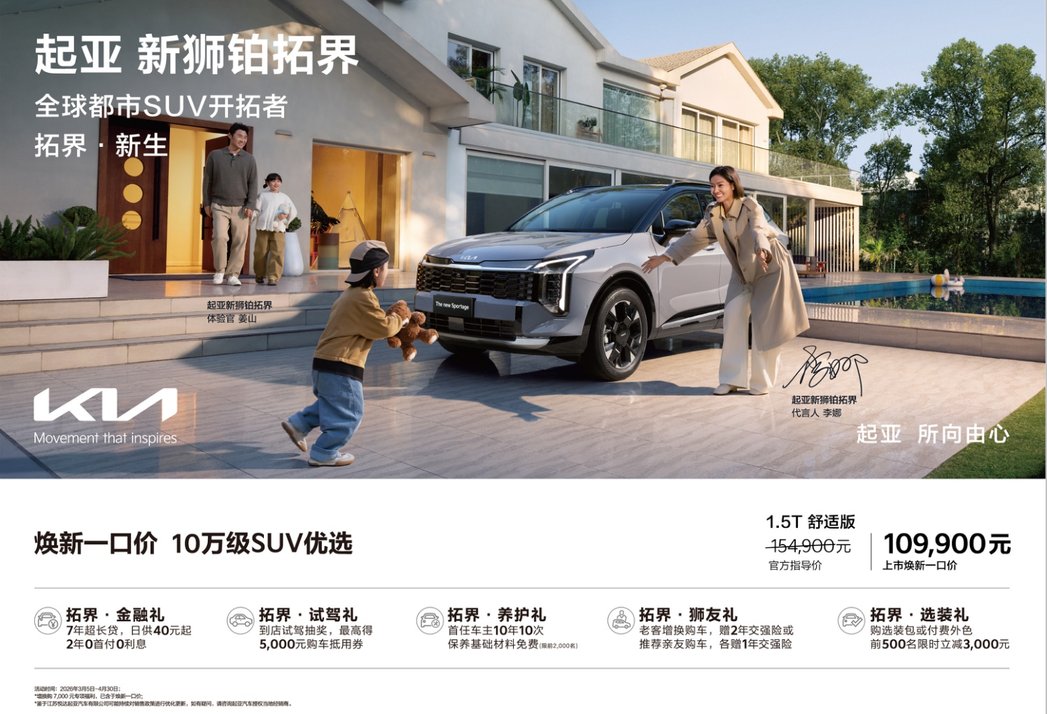 2026年3月5日,起亚新狮铂拓界正式上市,共推出7款车型,并在中国首次提供X-Line专属运动设计包,官方指导价15.49万元-21.79万元。为回馈广大中国用户的信赖,即日起至4月30日,消费者购车即享全国统一“焕新一口价”10.99万元起!同时还可享金融礼、试驾礼、养护礼、狮友礼、选装礼5大尊享礼遇。